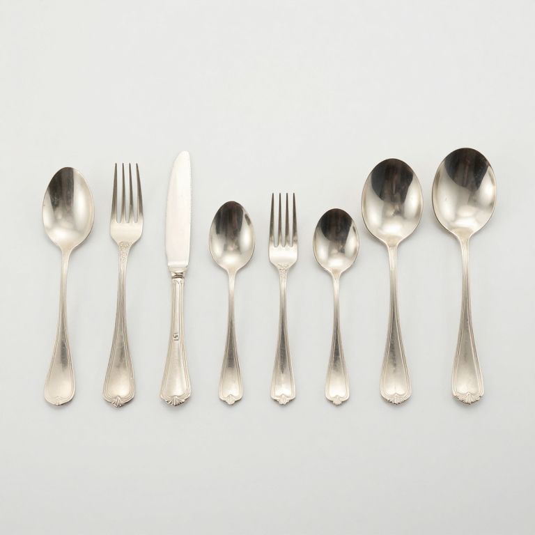 Photograph of seven silver-plated utensils arranged in a horizontal line against a white background. From left to right: a fork, a knife, three smaller forks, a spoon, and two larger spoons. The utensils have a shiny, reflective surface with a twisted, ornate design at the base. The smaller forks are evenly spaced between the spoon and the larger spoons, creating a balanced, symmetrical pattern. The white background enhances the silver's gleam, making the reflective surfaces prominent and eye-catching.