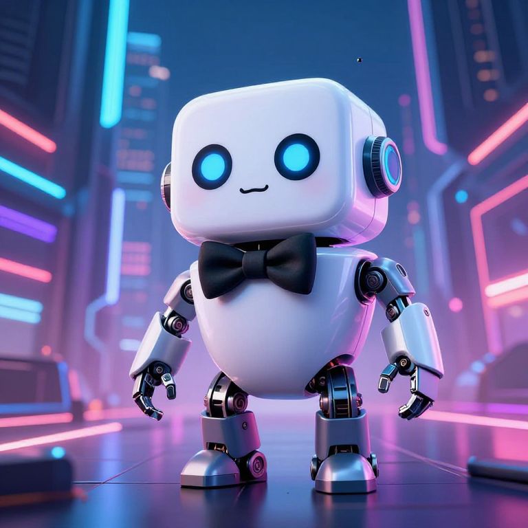 A CGI image of a cute, white, robot with a square head, glowing blue eyes, and a black bow tie stands in a futuristic, neon-lit cityscape. The robot has rounded arms and legs with visible joints, and its surface is sleek and shiny. The background features tall buildings with vibrant blue, pink, and purple neon lights, creating a cyberpunk atmosphere. The robot's expression is neutral, and it stands on a reflective, dark surface. The overall style is modern, with a playful and slightly whimsical tone.