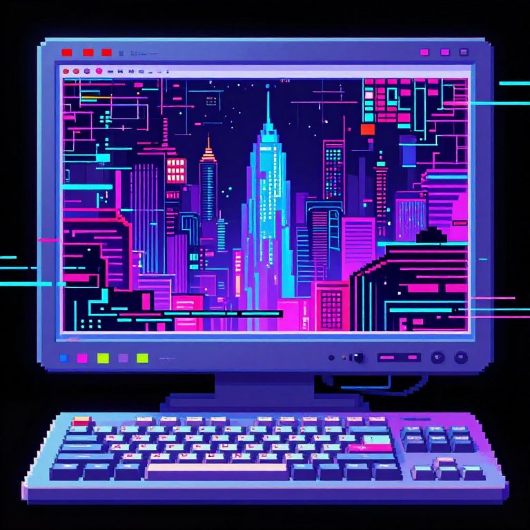 Pixelated images generator showcasing a retro computer interface, vibrant neon colors, glitch art style, futuristic pixel art elements, digital noise and scan lines, a vintage tech vibe with pixel blocks blending into a cyberpunk cityscape, detailed and textured