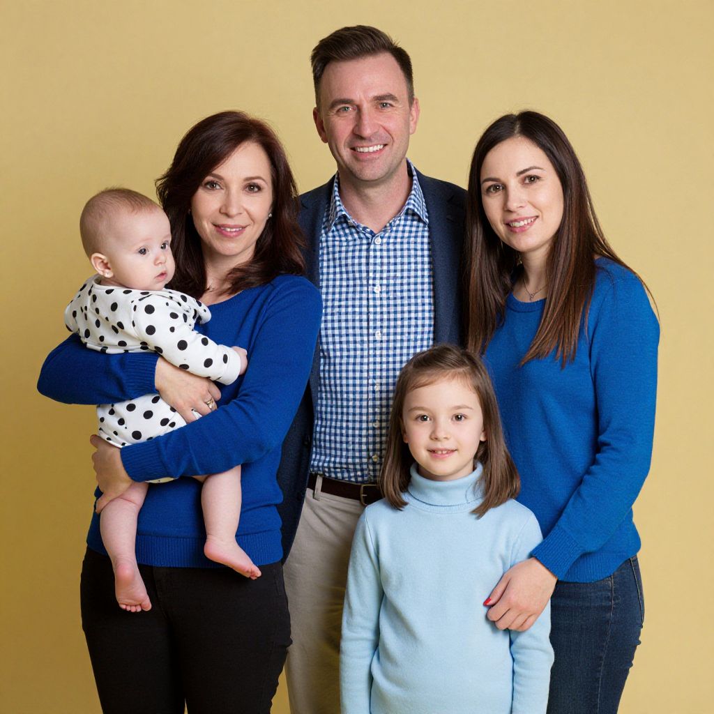 Family portrait featuring a smiling man in a checkered shirt and blazer, flanked by a woman in a blue sweater holding a baby in a polka-dot outfit, and a young girl in a light blue turtleneck sweater, all set against a warm yellow background.