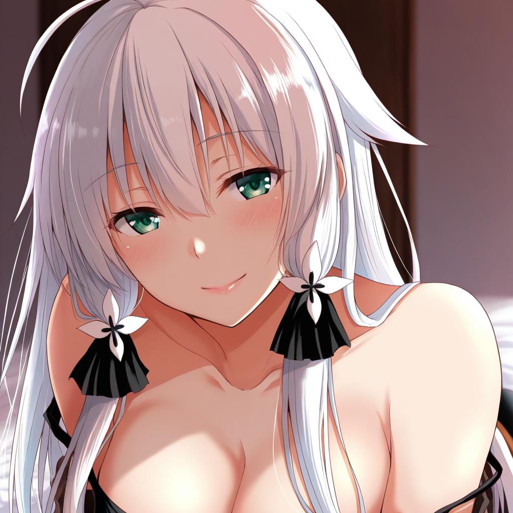 Digital illustration of a female anime character with long white hair, green eyes, and light skin. She is wearing black and white floral earrings and has a subtle smile. The artwork is rendered in a detailed style with soft shading and highlights, emphasizing her facial features and hair texture.