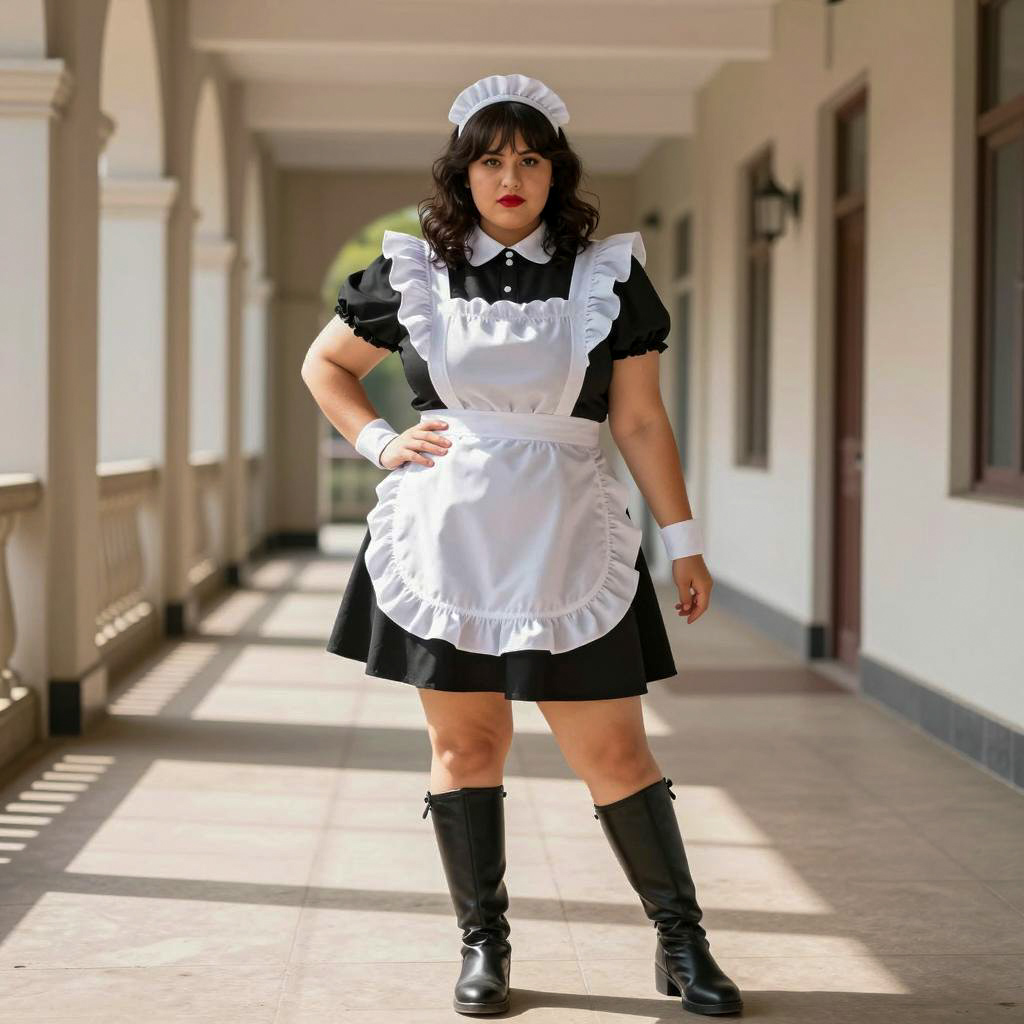 Plus size miss krueger, photograph of a plus-sized woman in a black and white maid outfit, standing in a sunlit hallway, short black sleeves, white apron, black knee-high boots, white wrist cuffs, dark wavy hair, white maid headband, red lipstick, full body shot, hallways with columns in background, bright daylight, realistic, detailed, confident stance, symmetrical composition, natural light