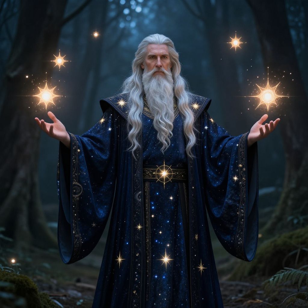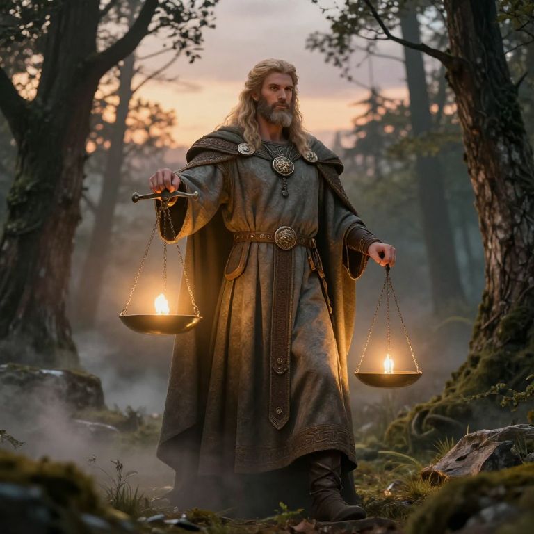 Forsetti, the Norse god of justice and reconciliation, depicted as a majestic figure standing in a serene ancient forest clearing, surrounded by golden light and ethereal mist, wearing traditional Viking robes and holding a balanced scale under a twilight sky.