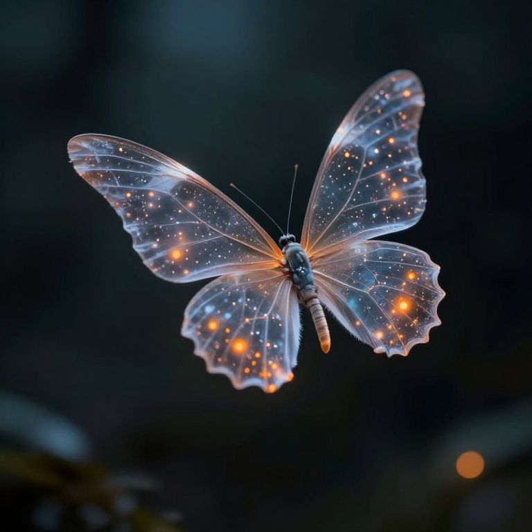 Photograph of a delicate, transparent butterfly with wings adorned with glowing orange and white dots against a dark, blurred background. The butterfly's wings are semi-transparent with a slight iridescent blue hue, and the orange dots are evenly scattered across the wings. The butterfly's body is dark and textured, providing a contrast to the luminous wings. The background is dark, with soft bokeh lights in orange and blue, emphasizing the butterfly's ethereal glow. The image has a magical, otherworldly feel, highlighting the beauty and fragility of the butterfly.