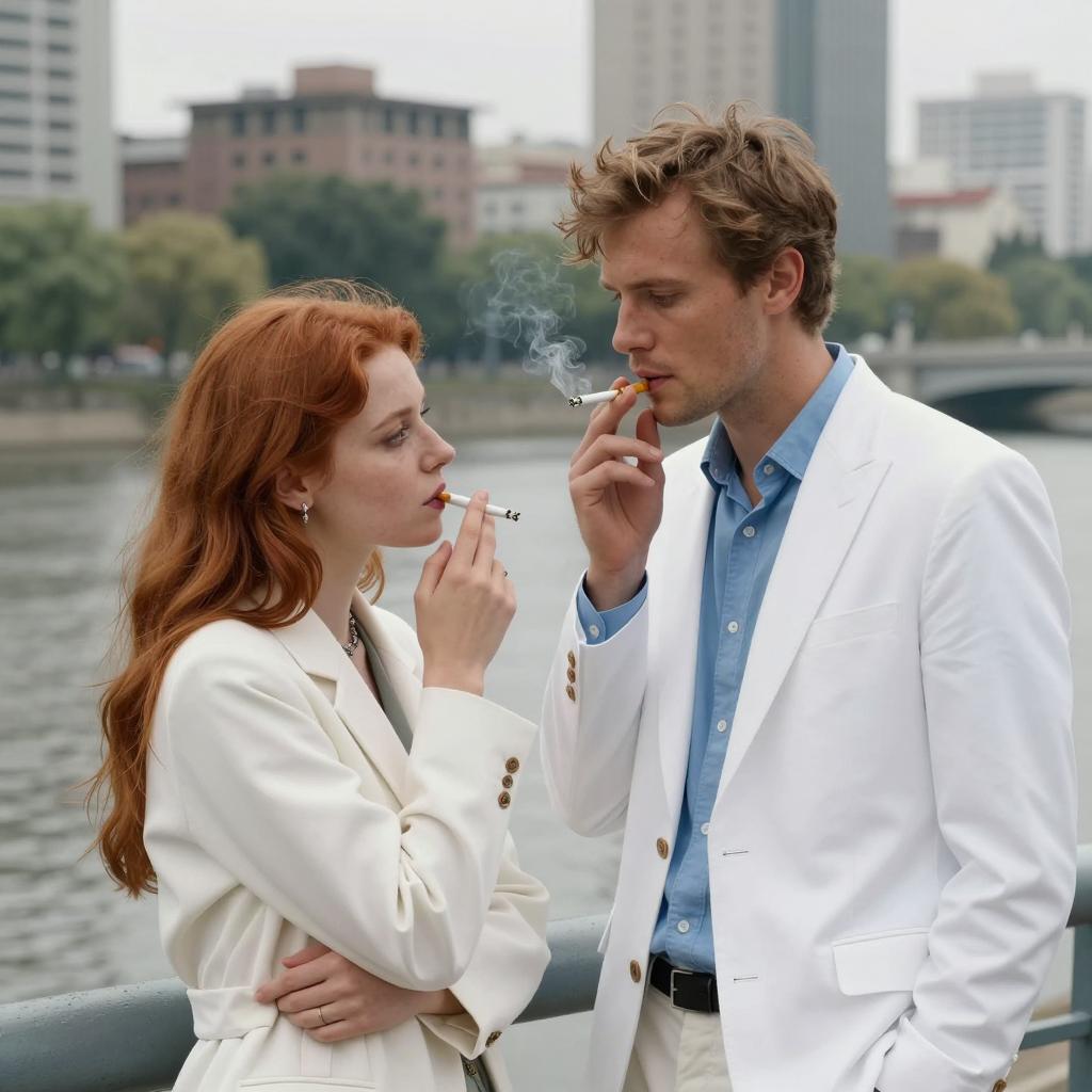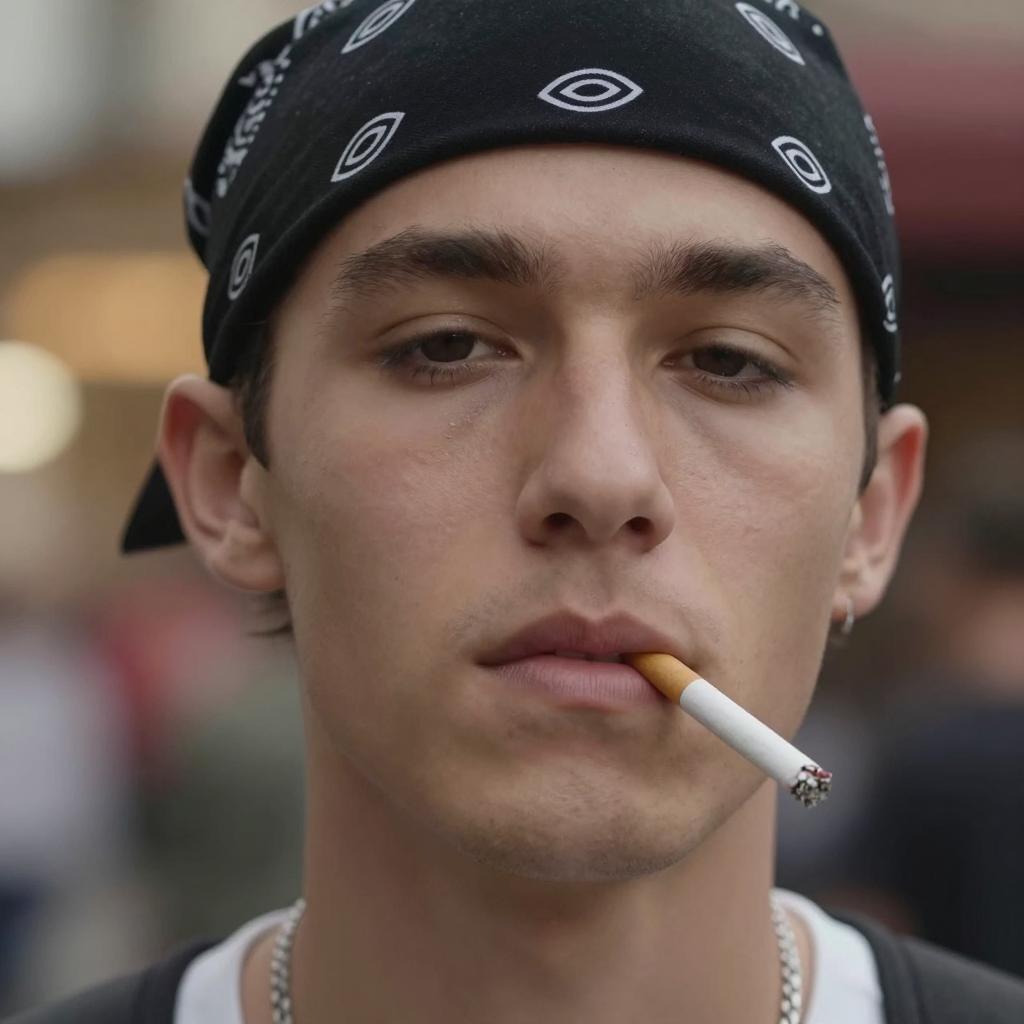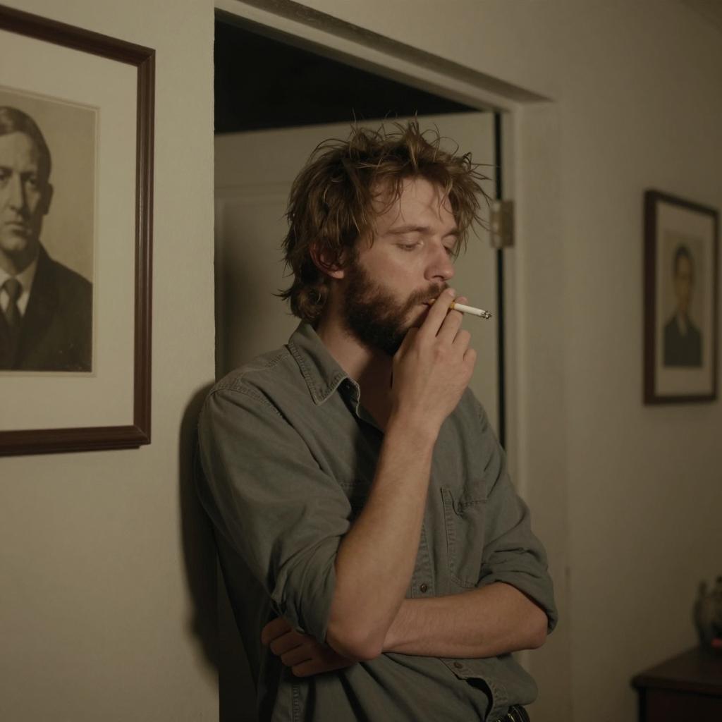 Man with short, messy brown hair and stubble, wearing a green jacket, smoking a cigarette. He is inside a dimly lit vehicle with floral-patterned upholstery and yellow-striped windows. He is in a side profile, eyes closed, hand holding cigarette to mouth. Sunlight brightens the right side of the image.