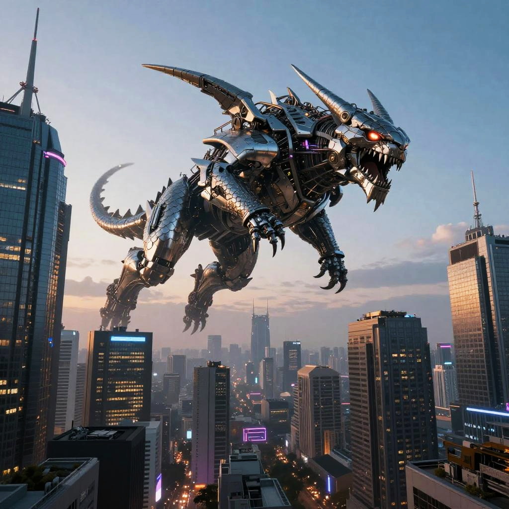 A futuristic cityscape dominated by a colossal smorm beast soaring above skyscrapers, with neon lights reflecting off its metallic scales, cyberpunk aesthetic, dynamic composition, dusk time, ultra-realistic textures