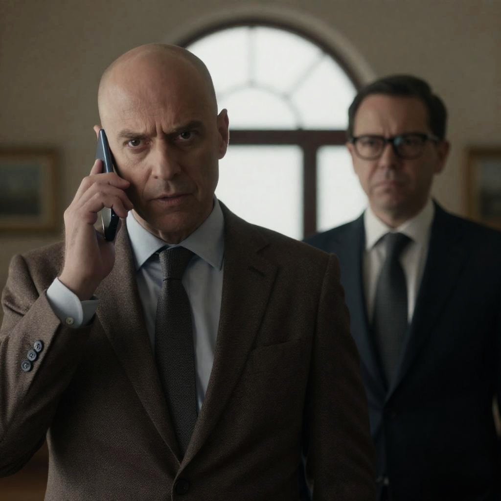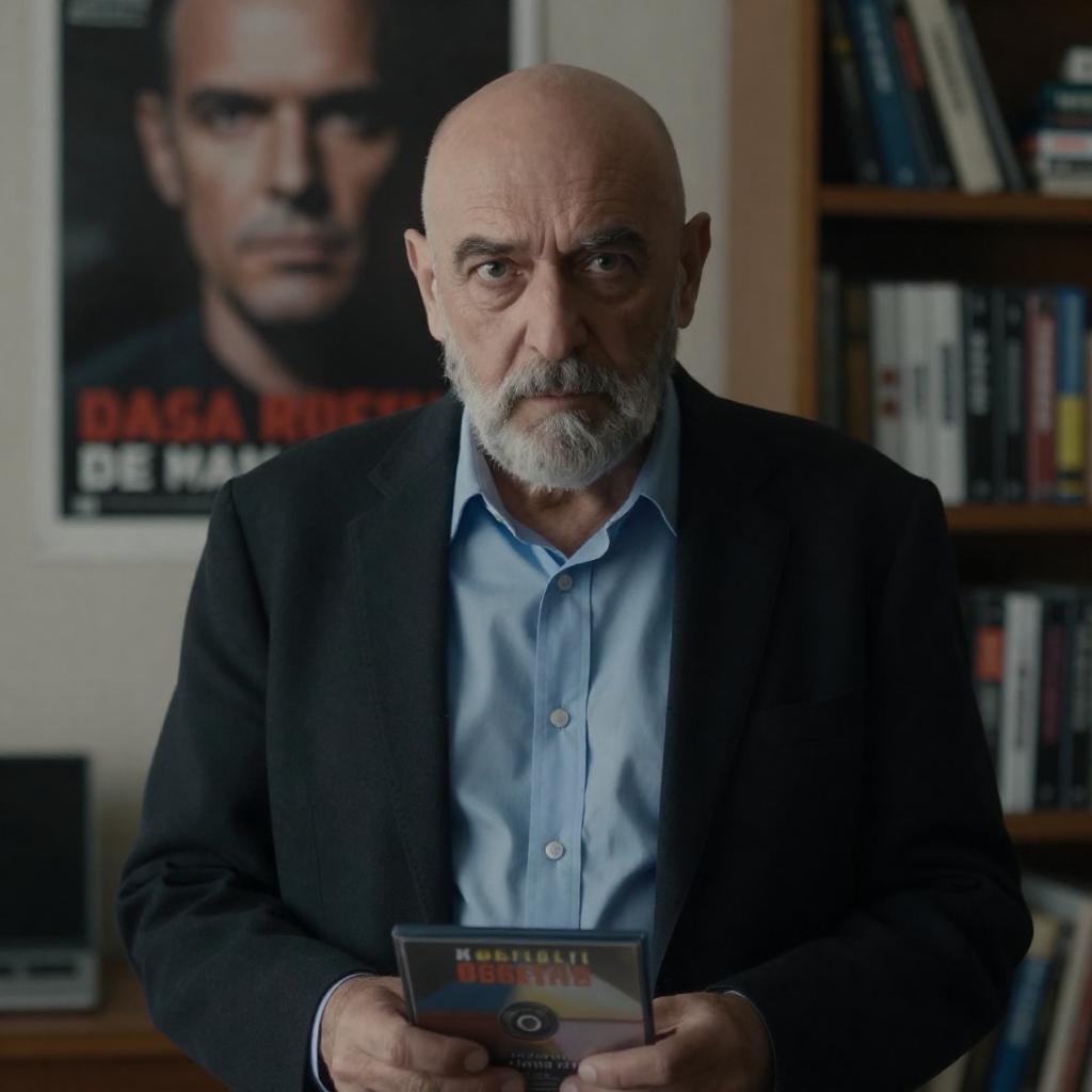 Photograph of an older man with a bald head and gray beard, wearing a black blazer and blue shirt, holding a DVD in a dimly lit room. Behind him, a poster with a man's face and French . Shelves with books and DVDs in the background. Another person's arm visible on the right. Intense facial expression.