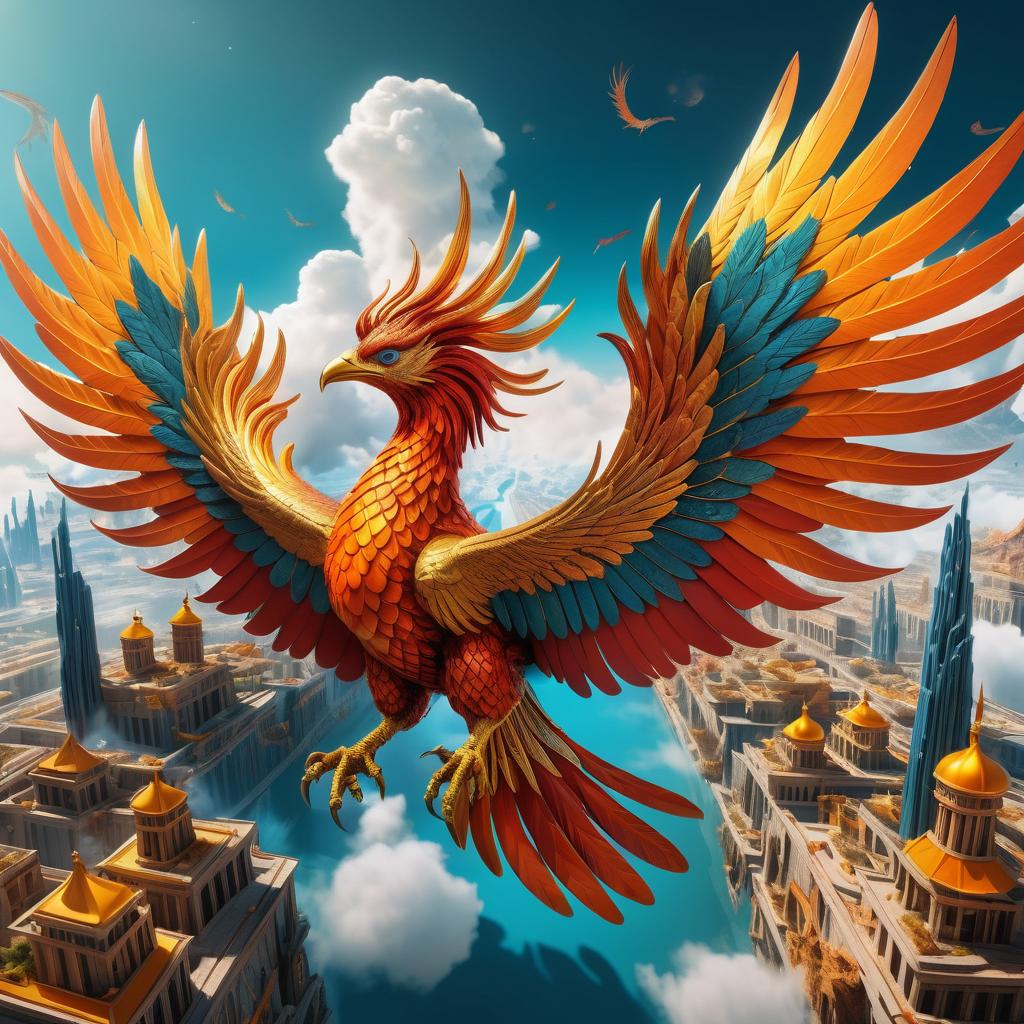 A hyper-realistic digital artwork of a vividly colored mythical phoenix soaring above an ancient floating cloud city. The phoenix features intricate feathers with vibrant reds, oranges, and blues. The city below includes detailed classical architecture with towering spires and terracotta rooftops, set amidst large billowing clouds and a river with boats. The style is inspired by Salvador Dalí and Van Gogh, rendered in 8K resolution capturing a surreal and imaginative atmosphere.