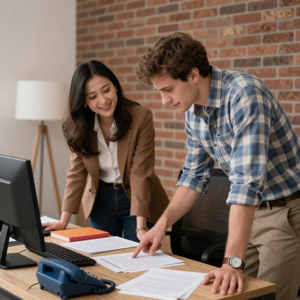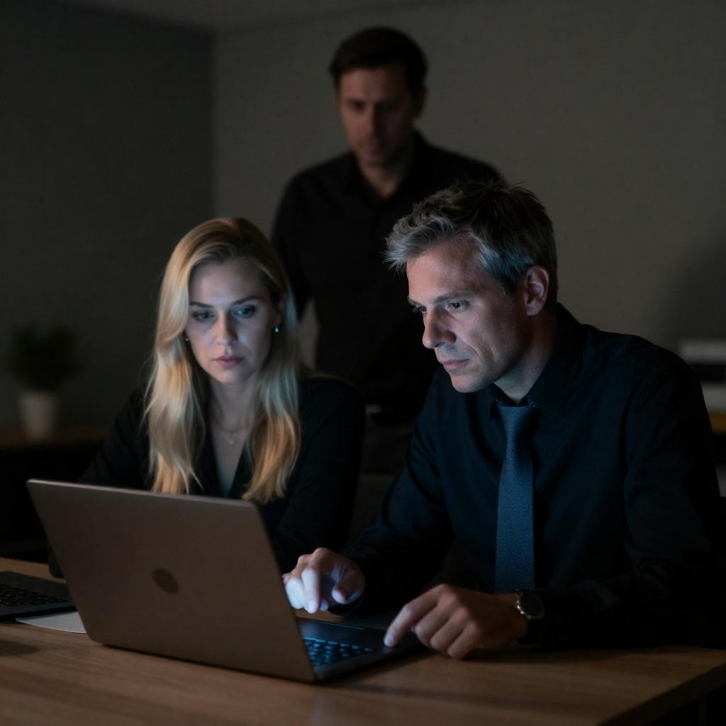 Photograph of a middle-aged man with a gray beard and black jacket, and a young woman with dark hair and brown top, closely examining a computer screen together in a dimly lit room. The man's expression is focused, while the woman looks slightly curious. Warm, orange lighting in the background.