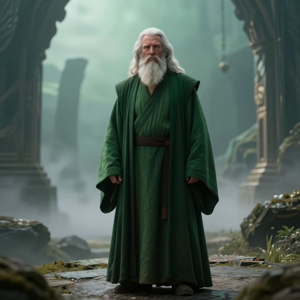 A wise Jedi master wearing green Jedi robes stands on a misty alien forest planet, ancient ruins in background, mystical and serene ambiance, photorealistic style