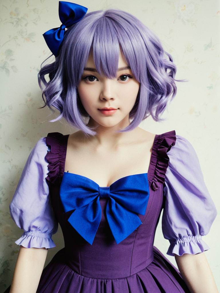 Violet Evergarden Wig, image of a woman in a purple dress and a blue bow