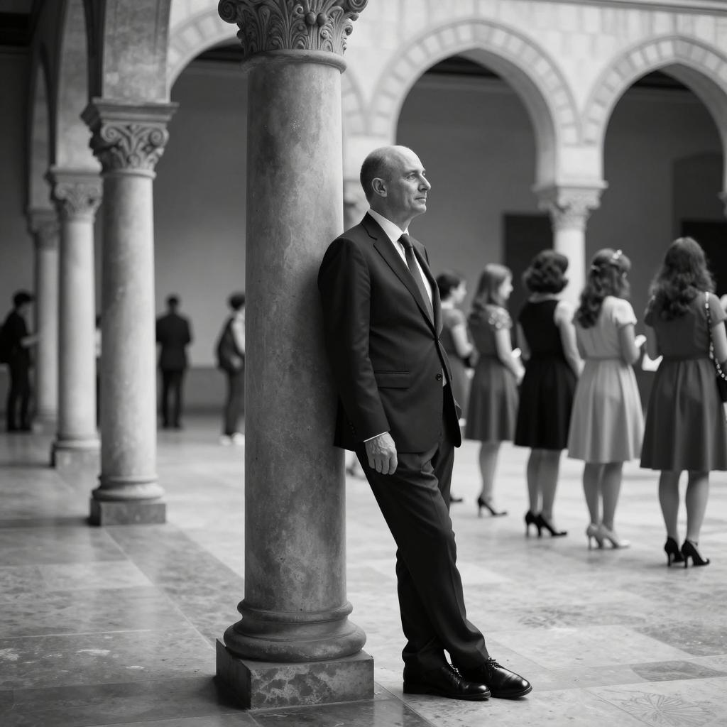 Black-and-white photograph. Middle-aged man in a suit, standing against ornate column, looking to the right. Background: series of columns, patterned arches, and people in dresses walking away. Man bald, formal attire, relaxed posture. People in background blurred, wearing knee-length dresses, heels, standing in line. Shadows and light create contrast. High-ceilinged, elegant interior.