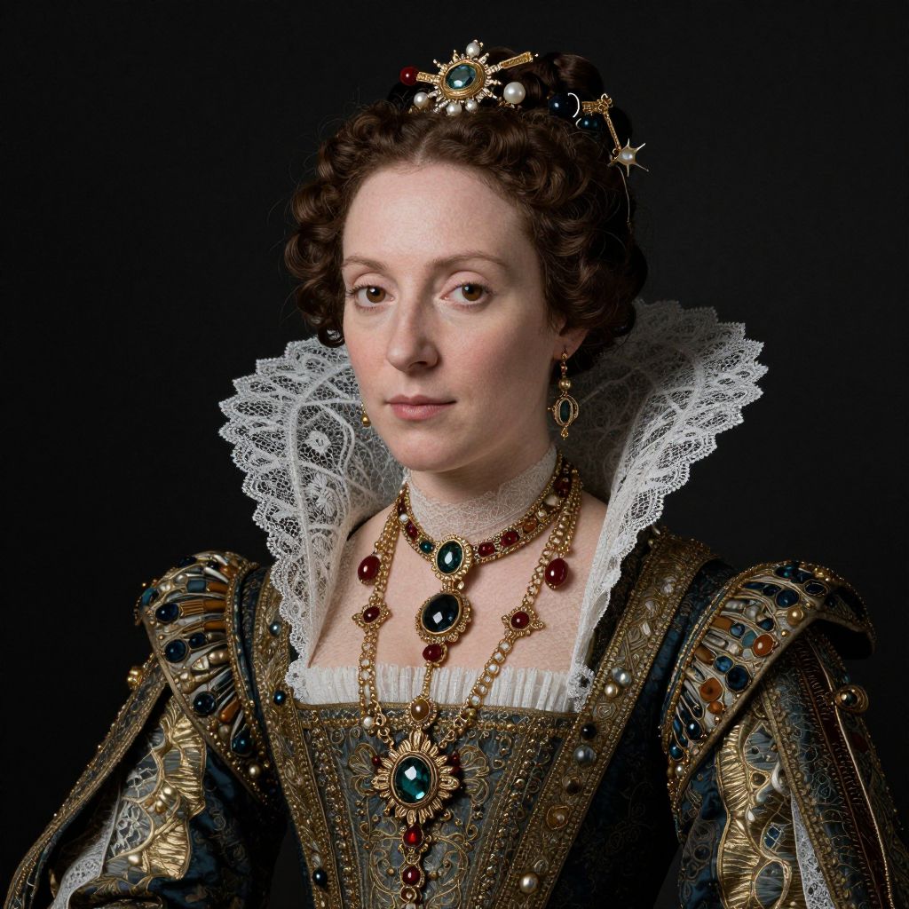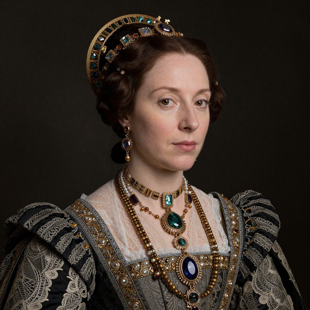 A digitally rendered portrait in a Renaissance-inspired style depicts a woman adorned in ornate jewelry and a lace-trimmed gown, evoking the elegance of historical figures such as Lady Jane Grey or Katharine Parr, with a striking resemblance to the latter.