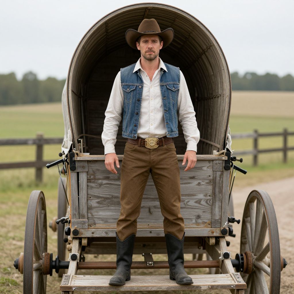 Jurassic Park Wagon Costume, man in a cowboy hat standing in a covered wagon