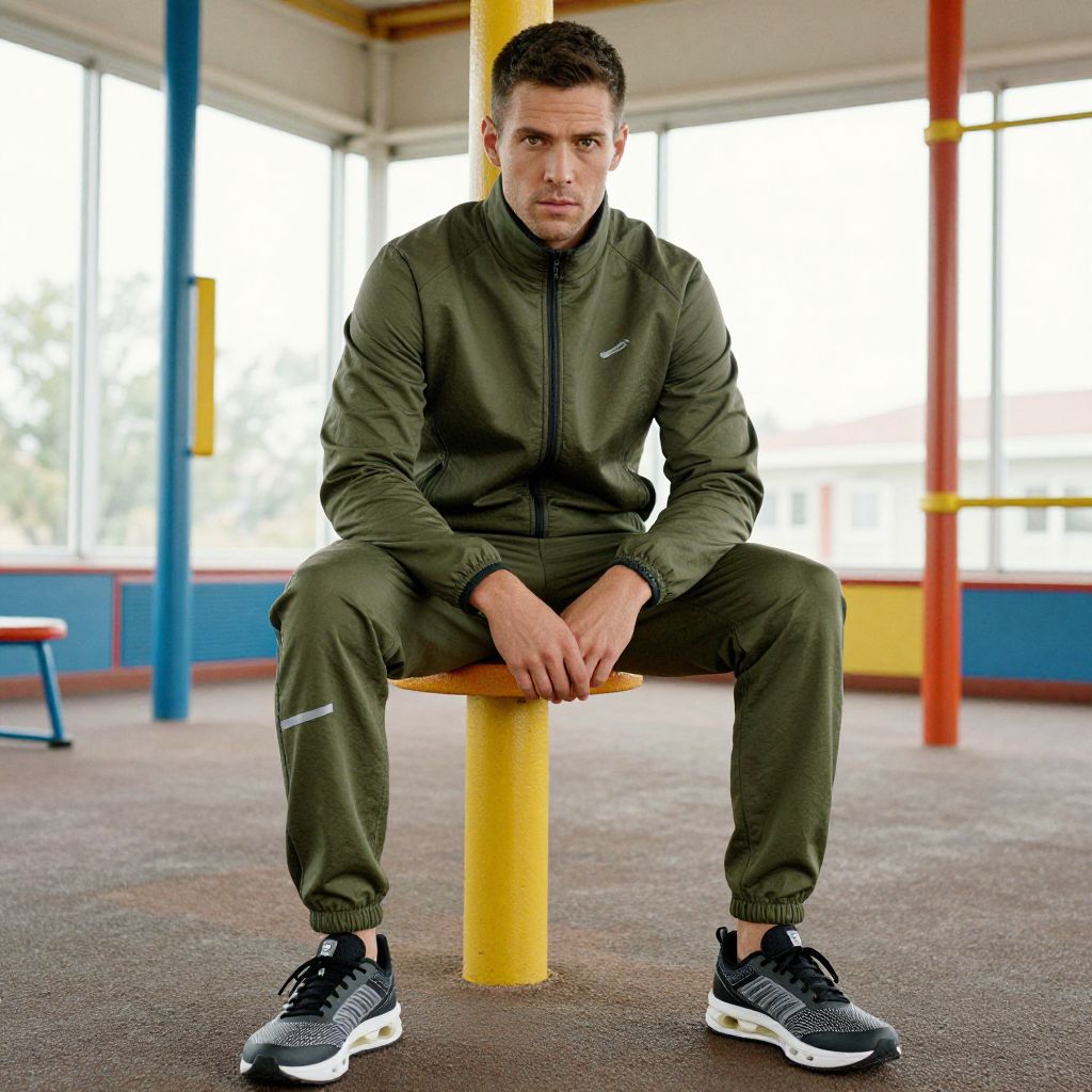 A man, performance fabric zip-up jacket, olive green, matching joggers, reflective details, cushioned running shoes, bright open space, large windows, colorful workout equipment, oversaturated film, focused expression Man has masculine face and piercing eyes