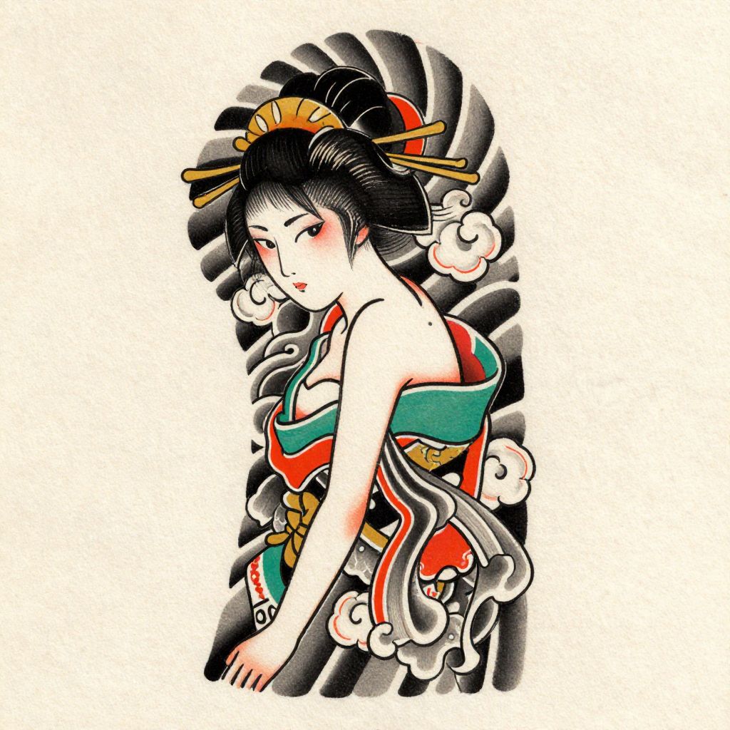 Chord Japanese style tattoo, [a typical japanese woman in anime style] design, bold outlines, modern, stylized designs, flowing and organic lines, bright colors, 2d art, full art in view - V 4,
