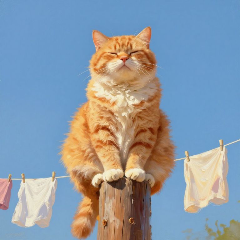 Prompt: An oil painting of a fluffy, chubby ginger cat with a soft patch of white fur on its chest, sitting with closed eyes atop the end of a tall wooden pole, radiating an air of peace and satisfaction, Its plump body and lazy posture reflect its contentment, as all four paws rest securely on the pole, The view is captured from below, giving the cat a majestic, almost regal position against the bright blue sky, Bold, expressive brushstrokes add texture to the thick fur and soft whiskers, emphasizing its fluffiness and round shape, In the background, laundry hangs on a line, delicately blowing in the breeze—simple pieces in whites and pastel colors, contrasting with the ginger fur of the cat, The sun casts a warm, golden light across the scene, highlighting the richness of the cat's fur and the wood grain on the pole, The overall impression is one of peaceful idleness and warmth, with a playful nod to the cat’s lazy, carefree nature in a scene that feels both rustic and cozy, bold brushstrokes, OByouhua