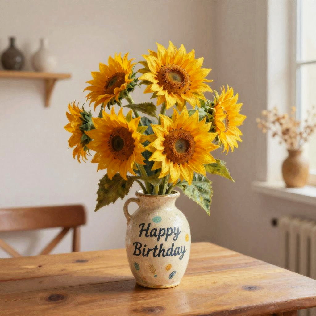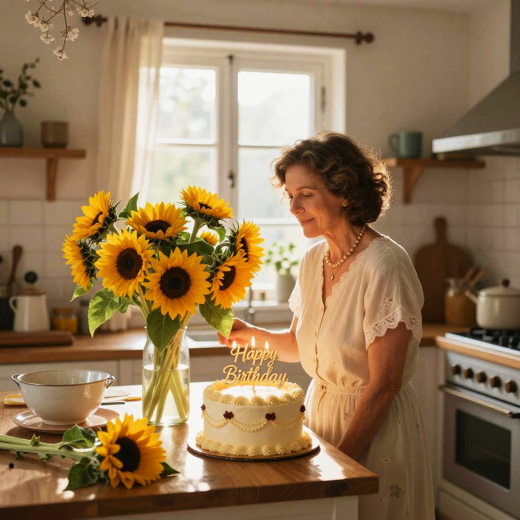 Happy birthday mom surrounded by a vibrant bouquet of sunflowers, soft sunlight streaming through a rustic kitchen window, warm and cozy atmosphere, delicate floral decorations, heartfelt celebration with a vintage birthday cake, painterly style