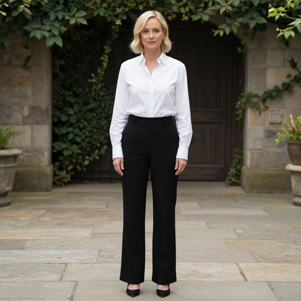 Photograph of a blonde woman standing outdoors in front of a stone building with ivy-covered walls and a dark wooden door. She has a fair complexion, wears a white long-sleeve blouse, black high-waisted wide-legged pants, and black flats. Her hair is shoulder-length, straight, and slightly parted to the side. She stands with a neutral expression, arms relaxed at her sides. The stone pathway she stands on is slightly weathered, and potted plants are visible on either side of the door. The lighting is natural, and the overall scene has a calm, professional atmosphere.