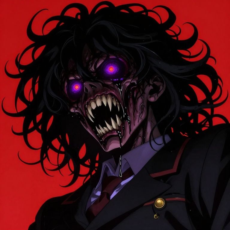 Digital anime-style drawing of a terrifying woman with long black hair, glowing red and purple eyes, and sharp, jagged teeth. She wears a dark school uniform with a red and black striped tie and an emblem on her blazer. Her hands, covered in dark, wispy tendrils, are positioned near her open mouth as if about to bite. The background is a vivid, solid red, enhancing the menacing atmosphere. The overall style is dark and dramatic, with high contrast and dynamic, fluid lines.