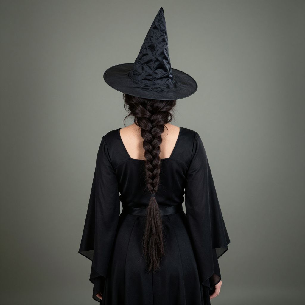 Photograph of a woman from behind, wearing a black, long-sleeved, floor-length dress with a square neckline. She has long, dark brown hair styled in a single braid that reaches down her back. She is also wearing a pointy, black witch hat adorned with a subtle, textured pattern. The background is a plain, gradient gray, drawing focus to her silhouette. The lighting is soft, creating a slightly shadowed effect on her back and dress. The overall style is reminiscent of a classic Halloween witch costume.