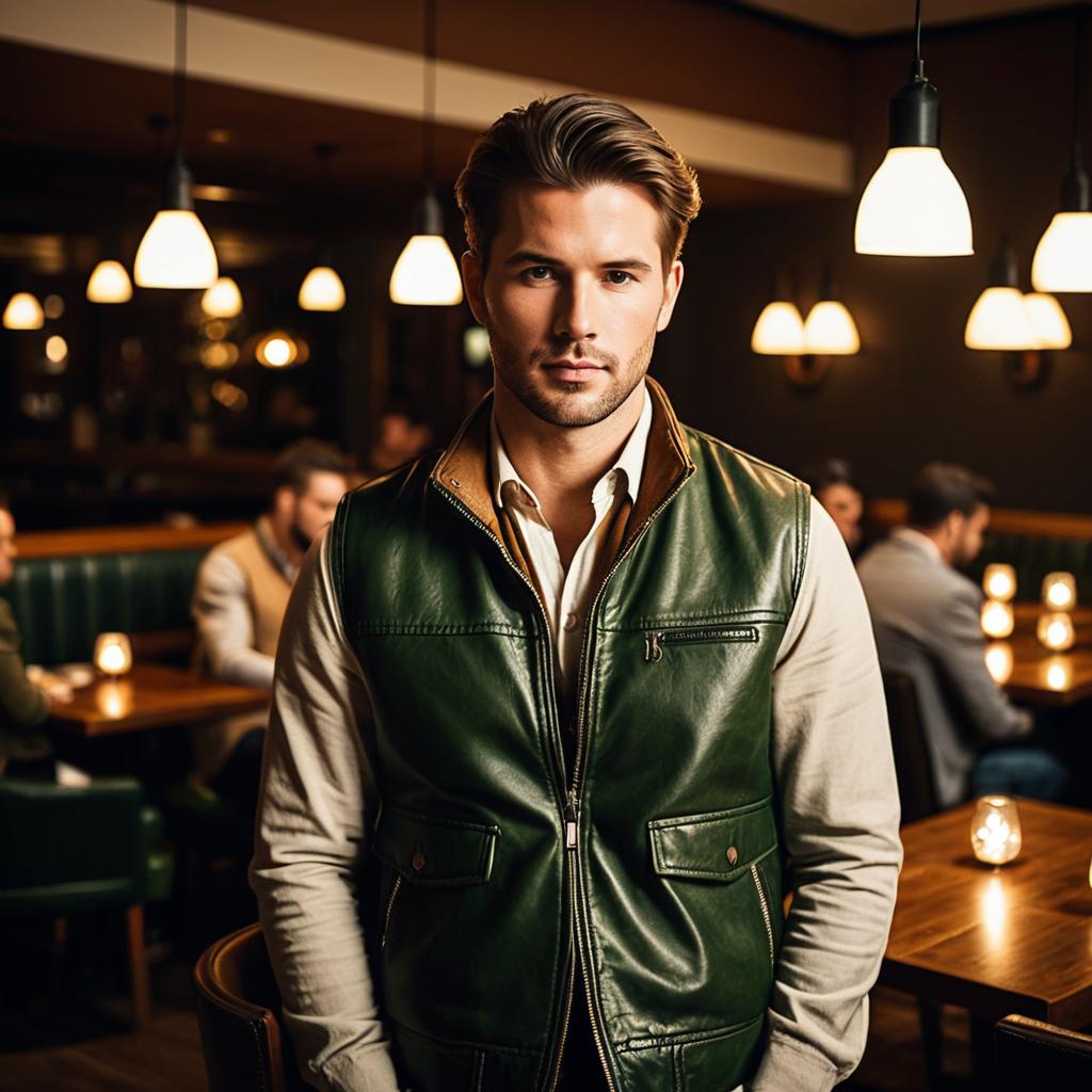 Photo of a handsome man in a dimly lit restaurant, standing in the foreground, stylish outfit, wearing a brown vest over a light grey shirt, green leather jacket, beige pants, confident expression, brown hair styled neatly, slightly parted, warm ambient lighting, hanging light bulbs, blurred background with other people sitting at tables, some with candles, modern rustic decor, warm tones, soft focus on background, focus on the man, realistic CGI style, high quality, professional lighting, casual elegance, stylish, contemporary atmosphere, warm and inviting ambiance, realistic ures, detailed clothing, restaurant setting, subtle shadows, medium shot