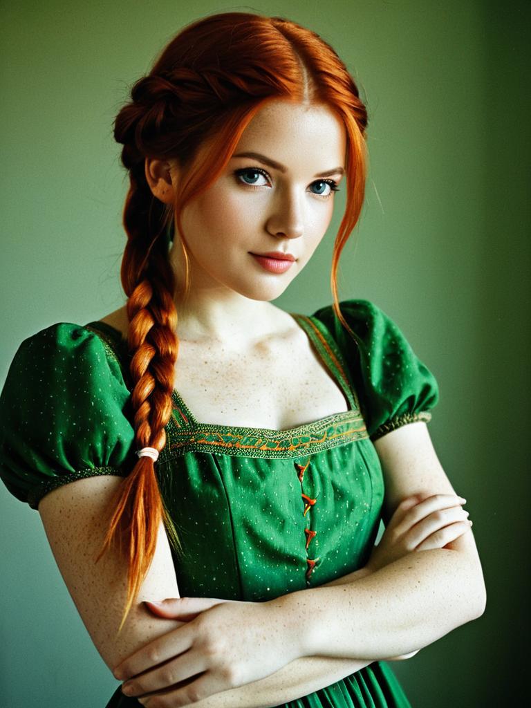 Princess anna green dress, 1girl, solo, crossed arms, braid, green dress, dress, long hair, single braid, brown hair, freckles, standing, orange hair, looking at viewer, hair over shoulder