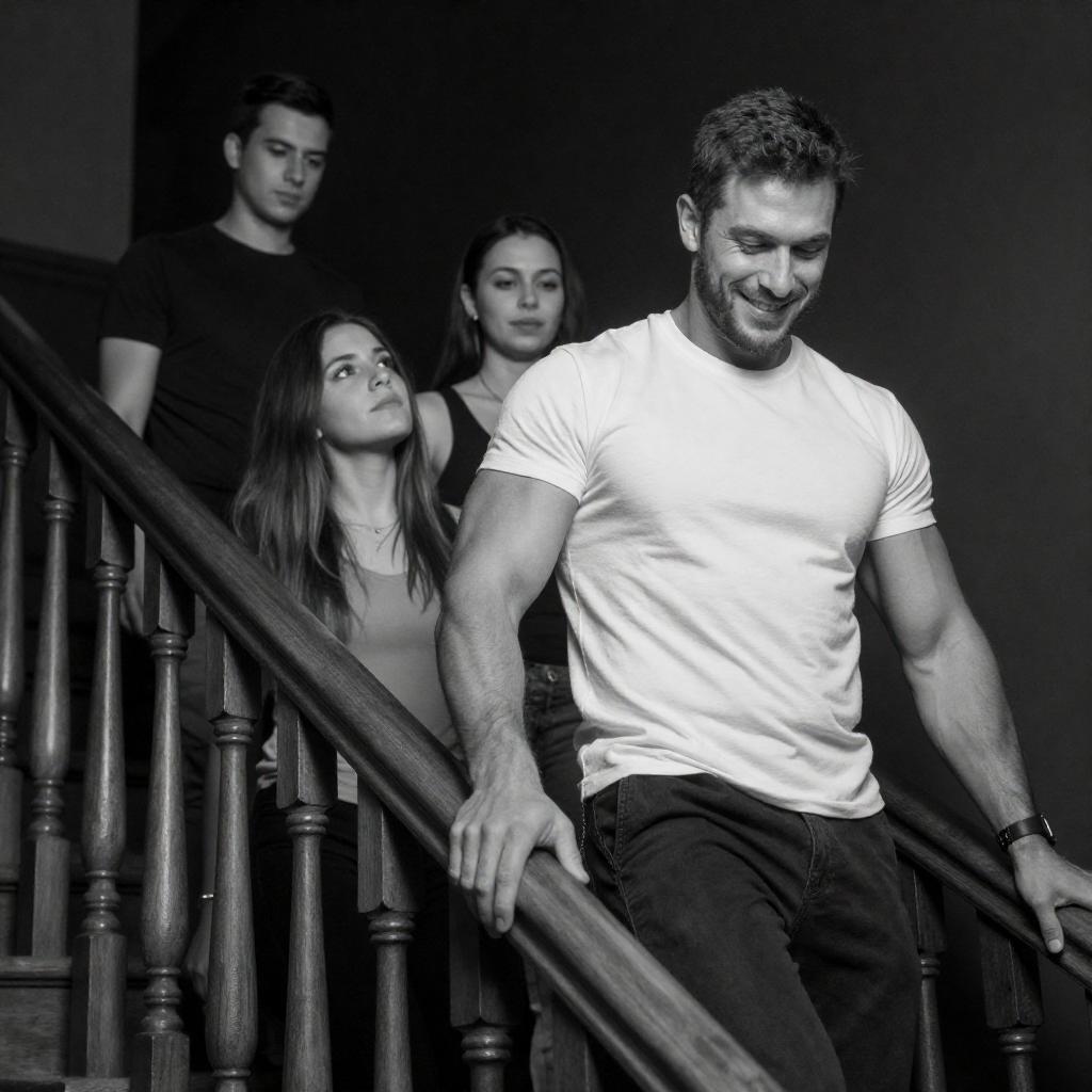 Black-and-white photograph of four people climbing a wooden staircase. A muscular man in a white t-shirt leads, smiling, with three others behind him. One woman with long hair looks up at him. The staircase has ornate railings, and the background is dark. The image has a high-contrast, gritty style.