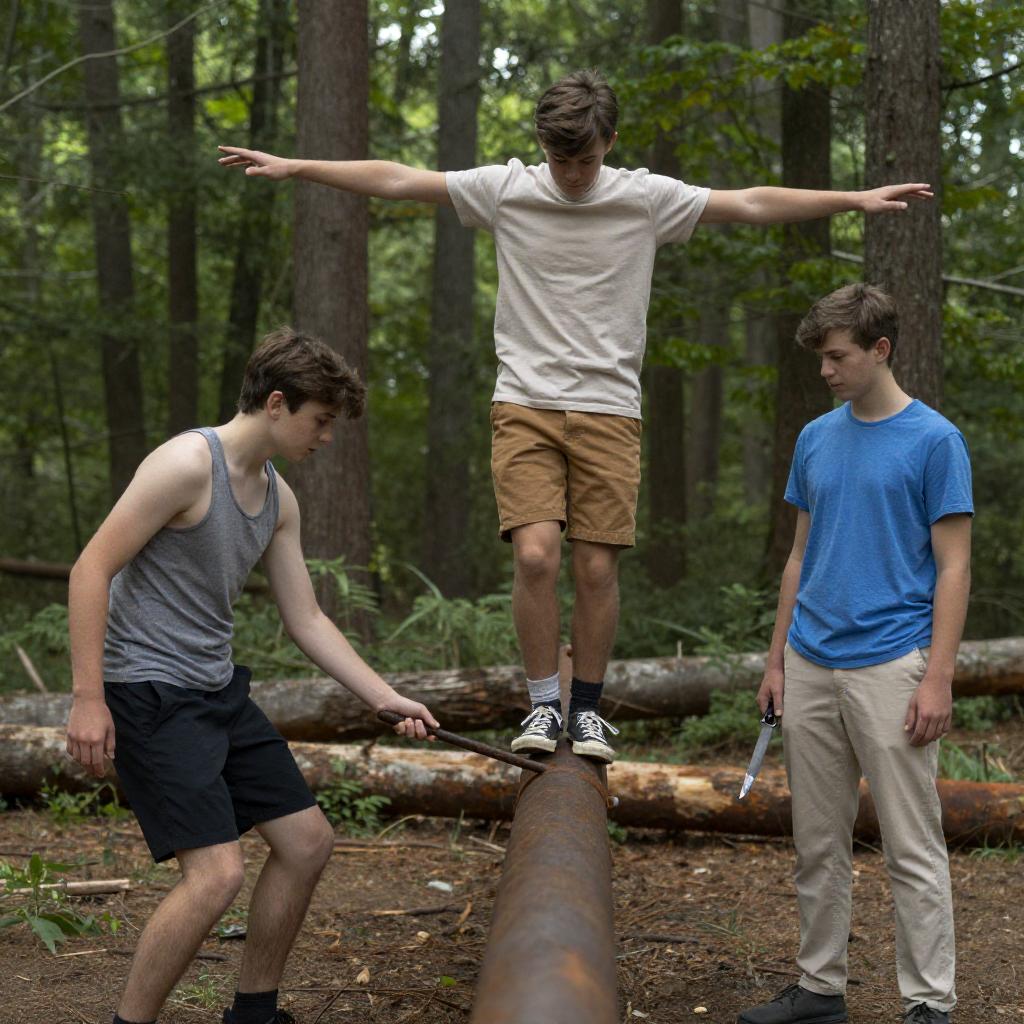 Photograph of three teenage boys in a forest. Center boy wears beige t-shirt and cap, arms around shoulders of left and right boys. Left boy in gray sleeveless shirt, right boy in blue shirt with hand on hip. All with short brown hair, neutral expressions. Background: tall trees, green foliage.