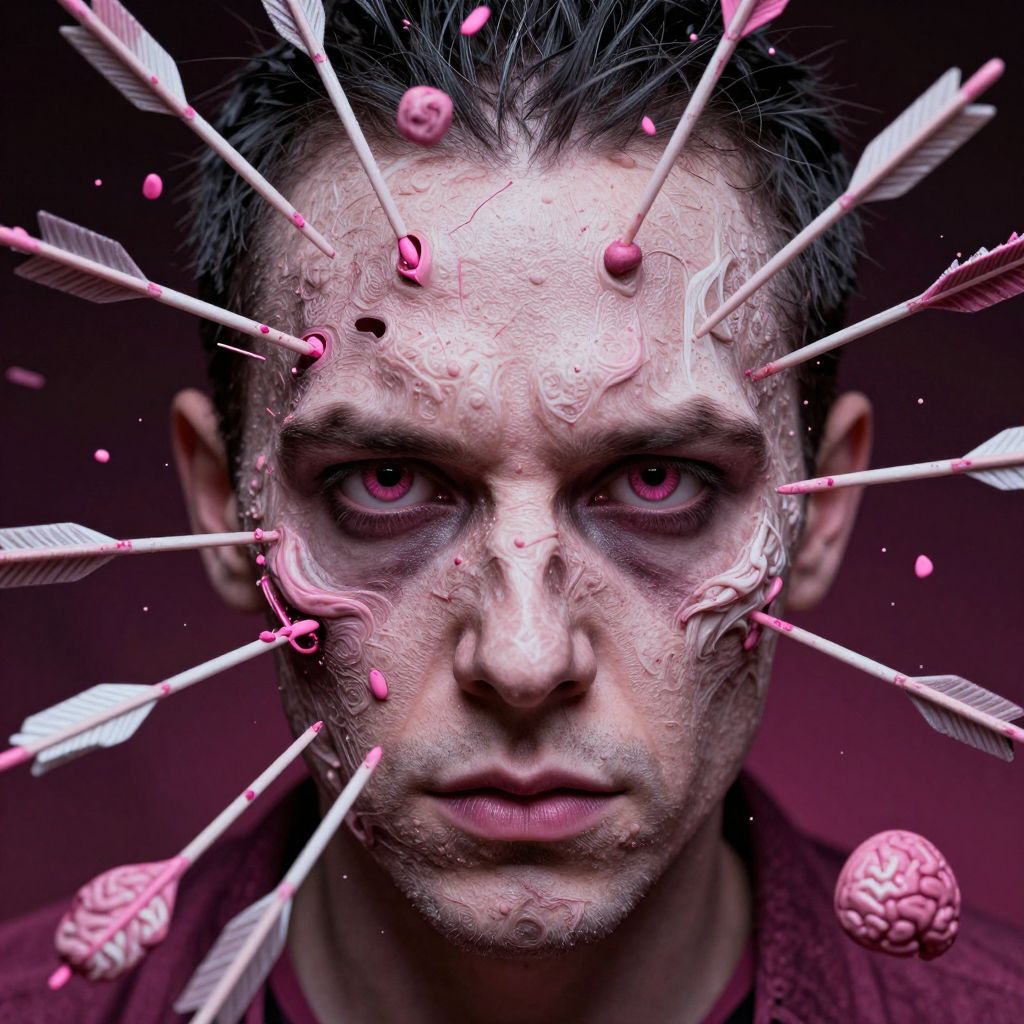 This digital artwork features a close-up of a serious-looking man with dark, short hair and pale skin. His face is adorned with numerous pink arrows and small pink spheres, some with white feathered ends, piercing his skin. A pink brain-shaped object is visible near his right temple. The background is a dark, gradient pink, emphasizing the surreal and otherworldly elements. The man's intense, pink-tinged eyes focus directly at the viewer, creating a sense of unease and intrigue. The style is hyper-realistic with a sci-fi, cybernetic theme.
