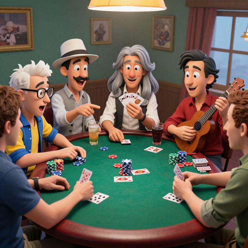 The image depicts a lively scene of five cartoon characters engaged in a game of poker at a green felt table. The characters, each with distinct personalities and attire, are deeply immersed in the game. The character on the far left, with white hair and glasses, is wearing a blue and yellow shirt and appears to be in a state of excitement or surprise. Next to him, a man with a white hat and a mustache is pointing at the cards, possibly indicating a winning hand or a strategic move. The third character, with long gray hair, is holding a deck of cards and seems to be in the middle of a conversation or explanation. The fourth character, wearing a red shirt and holding a ukulele, adds a musical element to the scene, suggesting a lighthearted or festive atmosphere. The fifth character, partially visible, is wearing a green shirt and appears to be focused on the game. Various poker chips, dice, and drinks are scattered across the table, enhancing the realism of the scene. The background features framed pictures and a window, adding depth and context to the setting. The overall composition is dynamic, with characters and objects interacting in a harmonious yet lively manner, capturing the essence of a friendly and competitive poker game.