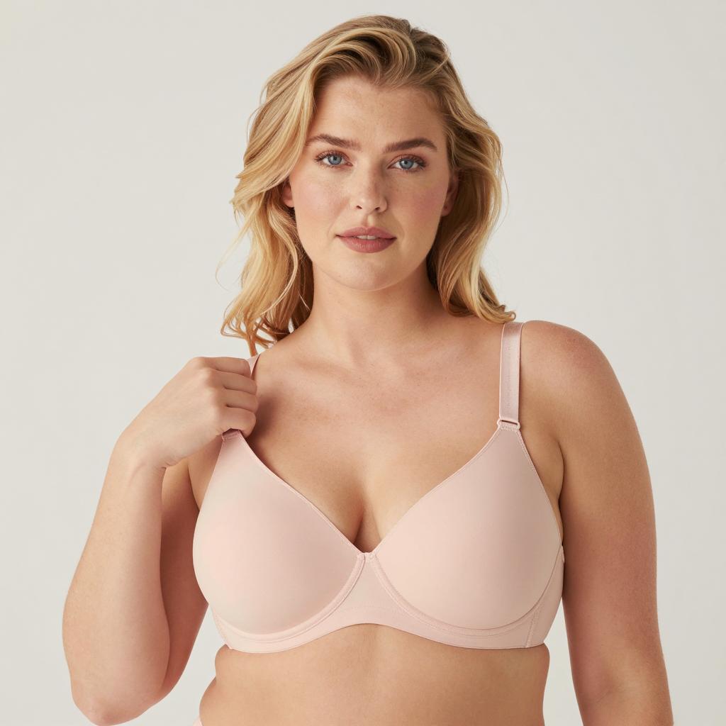 Photograph of a blonde woman with light skin and blue eyes, wearing a light pink bra. She has medium-length wavy hair, light makeup, and a relaxed expression. She holds the strap of her bra with her right hand. The background is a plain light color. Her breasts are medium to large-sized, and she is facing forward.