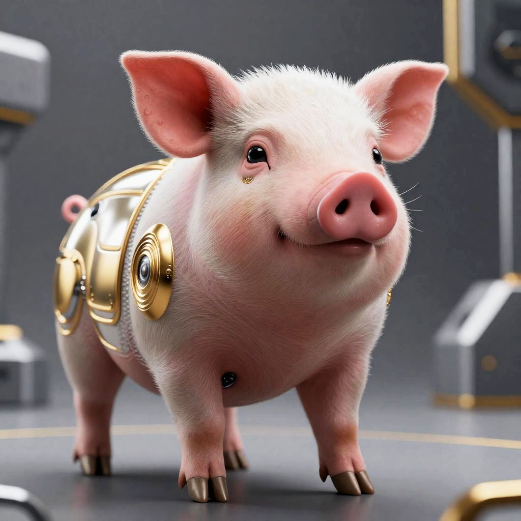 Close-up photorealistic image of a pink piglet featuring detailed cyborg elements including shiny gold and chrome robotic parts integrated on its back and joints. The piglet has a smooth, soft texture with a happy expression, set against a sleek, futuristic grey and chrome room background. The artwork is highly detailed and rendered in a super realistic style with high resolution and photorealistic lighting.