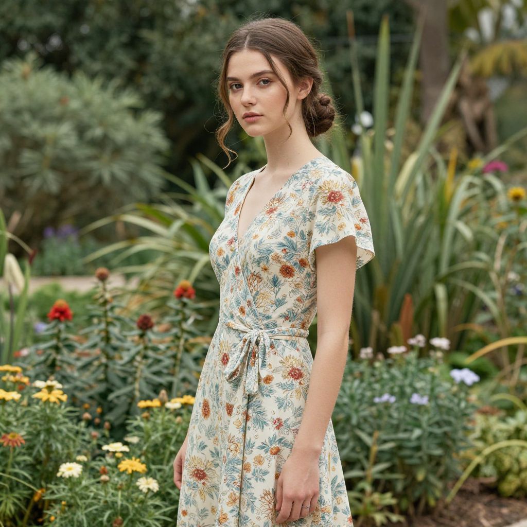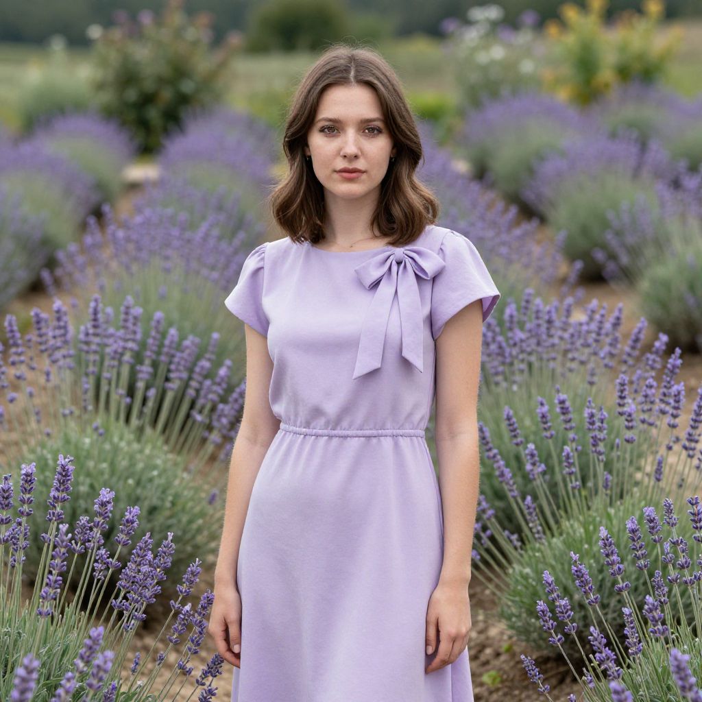 Portrait of a young woman with medium-length brown hair wearing a lilac-colored dress with a bow detail, standing amidst blooming lavender plants in a field. The setting features rows of purple lavender flowers and greenery under natural light, creating a serene and floral backdrop.
