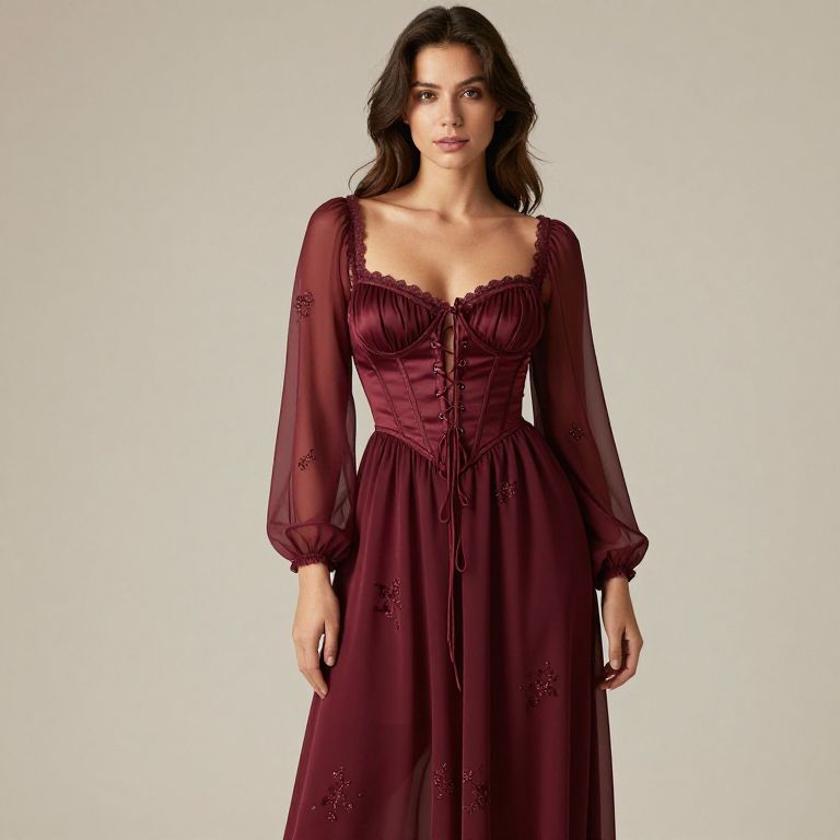 "Corset-inspired long sleeve dress, fitted bodice, lace-up front, satin fabric, deep burgundy color, flowing chiffon skirt, sheer long sleeves, delicate floral embroidery, vintage lace trim, ankle-length hem.. Sexy. Pretty face and beаutiful eyes. Big breasts."