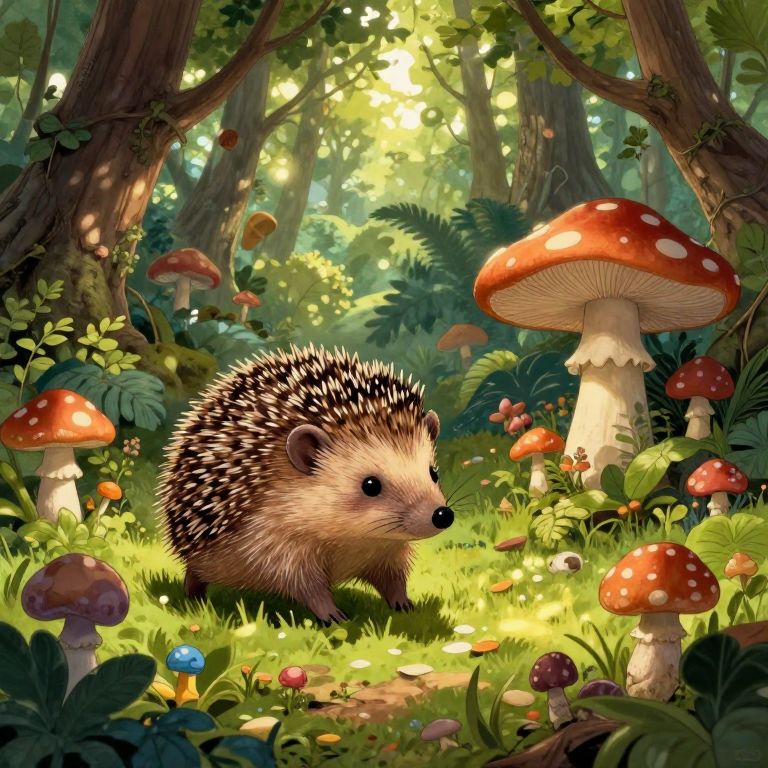 Craft an image in a whimsical style akin to Beatrix Potter's illustrations, portraying a curious hedgehog detective delving into a perplexing mystery within a magical mushroom forest. From a 'bug's-eye view', highlight the intricate details of the lush undergrowth and peculiar inhabitants as sunlight filters through the canopy, casting dappled shadows on the verdant floor. The gentle rustling of leaves carries secrets for our intrepid hero to uncover, weaving a tapestry of mystery and enchantment.