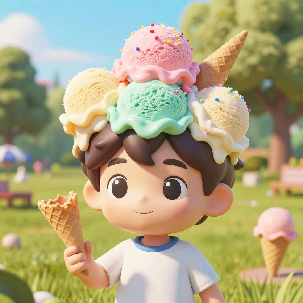Boys ice cream hair, a whimsical scene where young boys have colorful ice cream scoops instead of hair, vibrant pastel colors, playful summer vibes, sunny park background, detailed melting scoops with sprinkles and cones, imaginative and fun character design