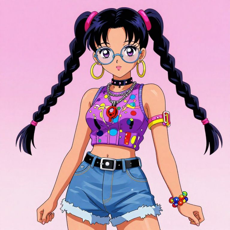 Anime-style drawing of a girl with black pigtails, glasses, colorful crop top, denim shorts, bracelets, and hoop earrings on pink background.