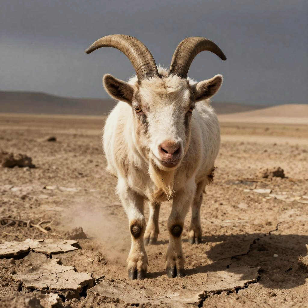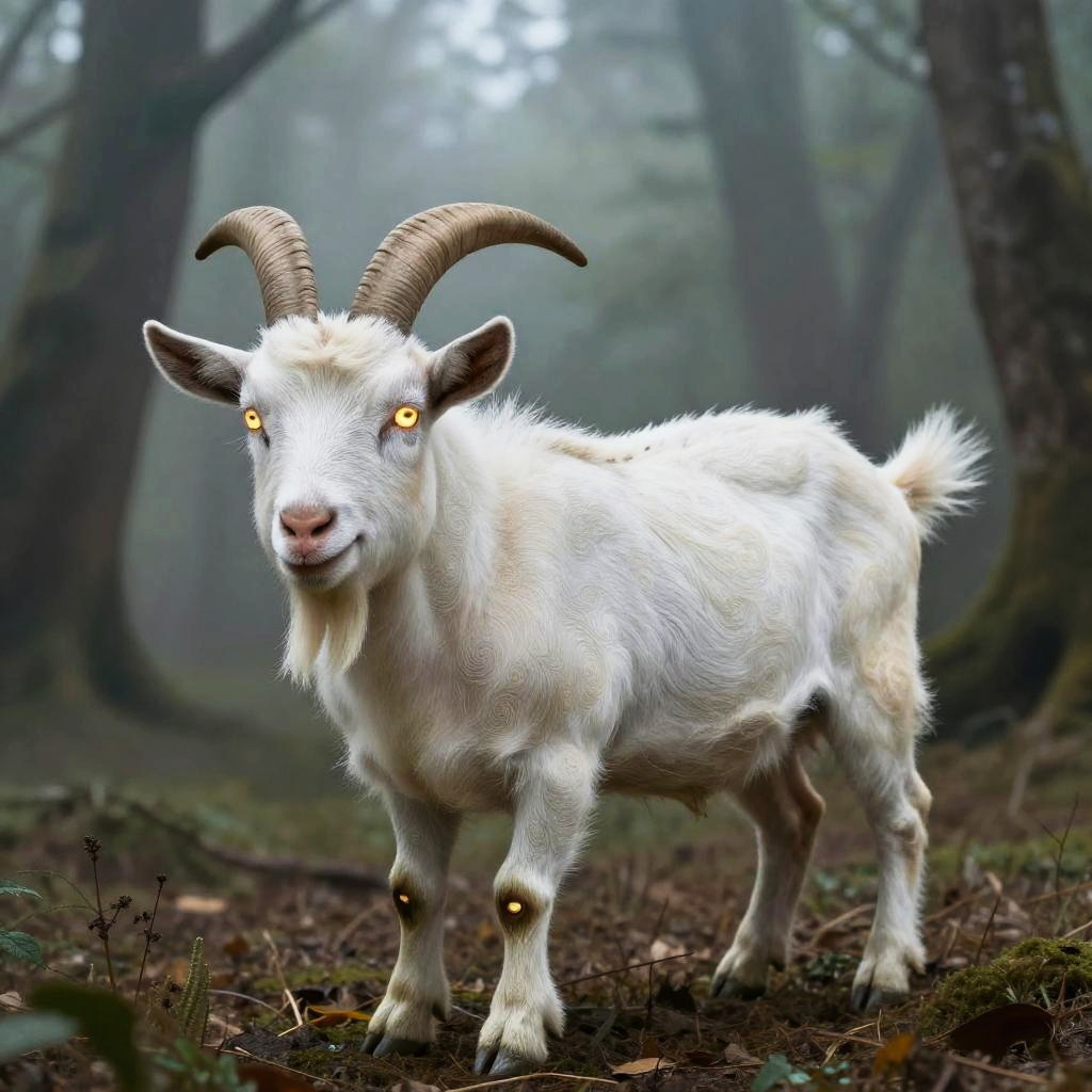 Pig goat hybrid creature standing on a rocky hill, surreal fantasy art style, detailed fur and skin texture, ominous twilight lighting, dramatic shadows, cinematic mood