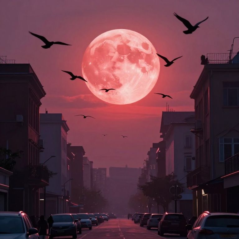 A surreal city street bathed in the ethereal glow of a massive, blood-red moon, as birds soar through the sky in perfect harmony with the dreamlike atmosphere.