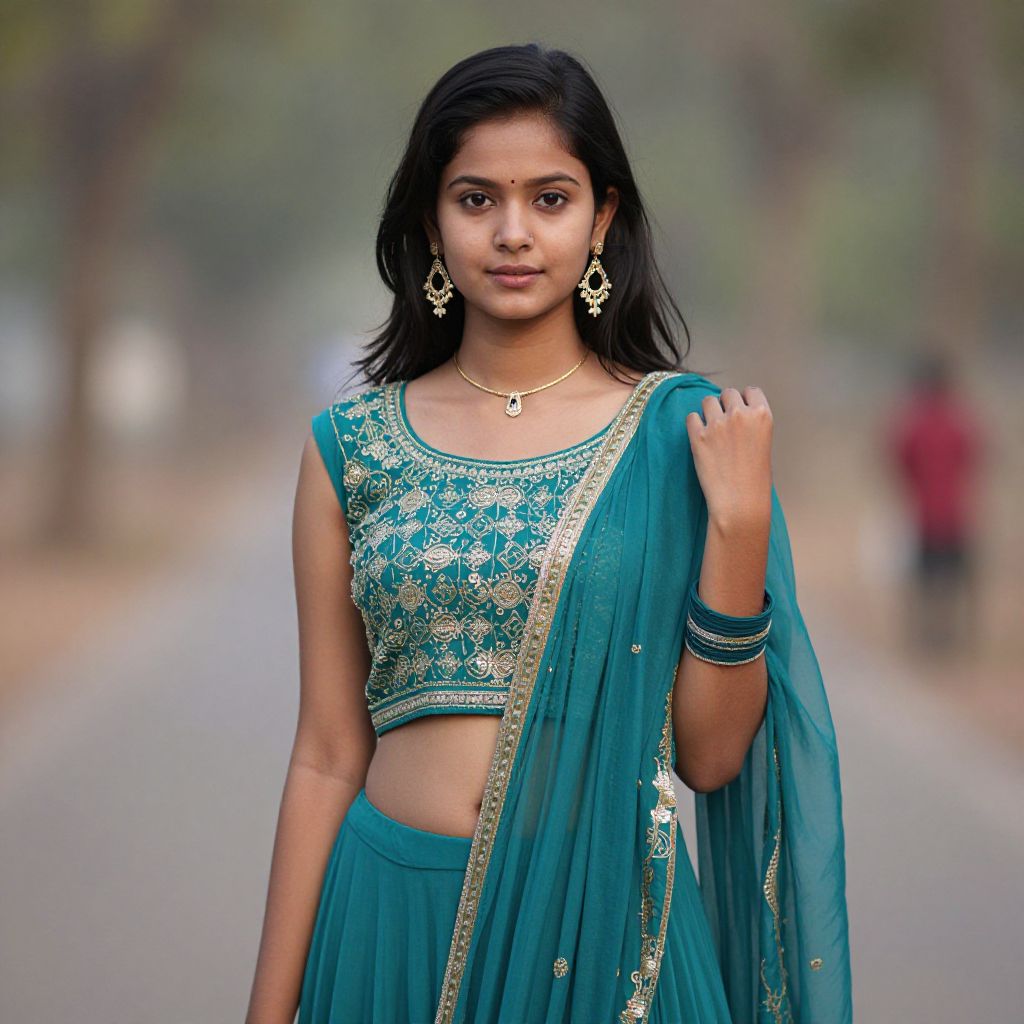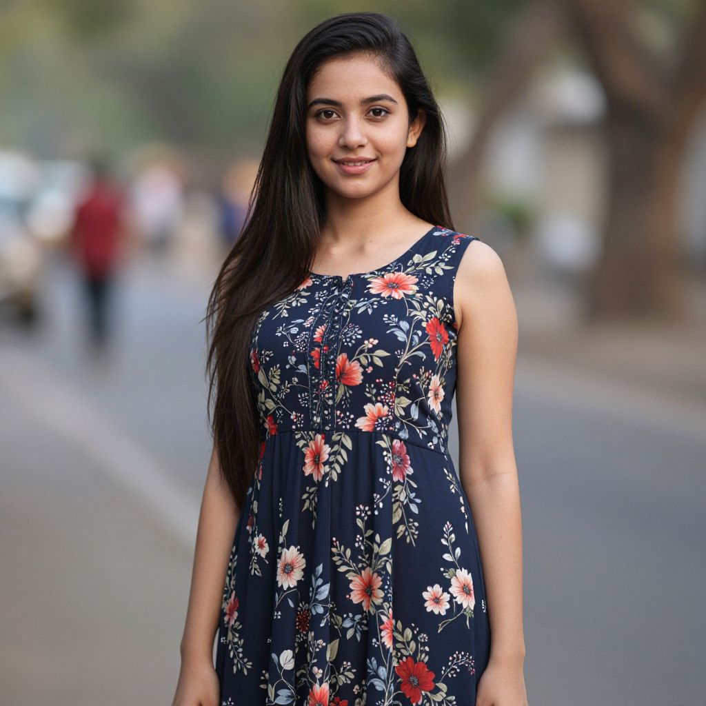 "plus size punjabi suits, 1girl, solo, dress, flower, outdoors, blurry, looking at viewer, black hair, long hair, blurry background, standing Realistic photo of casual sexy person with pretty face"