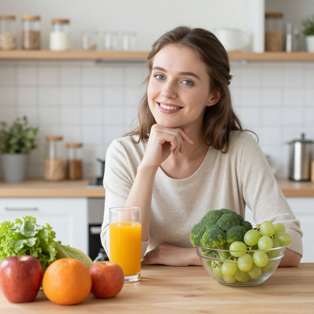 Smiling woman sitting in a cozy kitchen, surrounded by fresh produce, a vibrant orange juice, and a bowl of broccoli and grapes, embodying simple healthy eating habits.