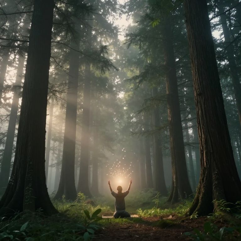 Rezando in a mystical forest clearing at dawn, soft fog surrounding tall ancient trees, a lone figure kneeling with hands raised, ethereal glowing light particles, serene nature blending with spiritual practice, dreamy and peaceful environment