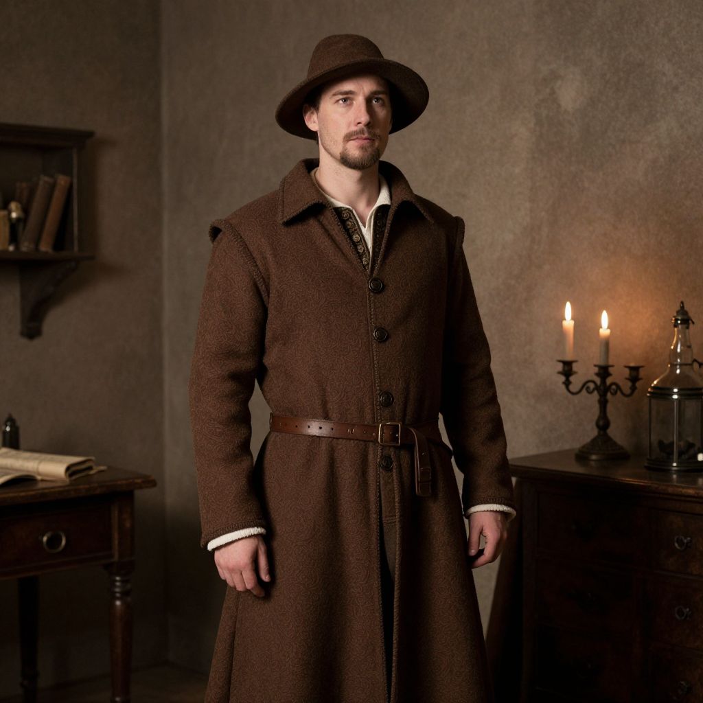 Medieval Apothecary Costume, man in a brown coat and hat standing in a room