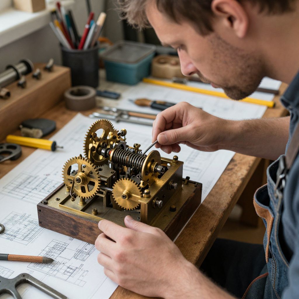 Photograph of a focused man with short brown hair and beard, assembling intricate brass gears on a wooden table, surrounded by tools and blue and yellow objects