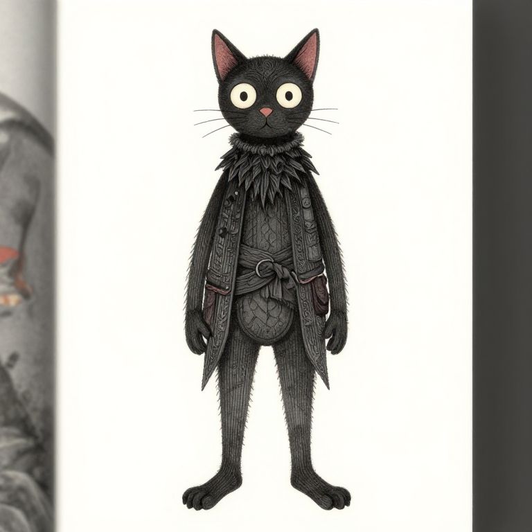 Detailed illustration of an anthropomorphic black cat dressed as a fantasy adventurer. The character features large, expressive eyes, textured fur, and wears an intricately designed long coat with feather-like collar details, belt, and gloves. The art style combines dark fantasy elements with watercolors and colored inks, inspired by Josephine Wall.