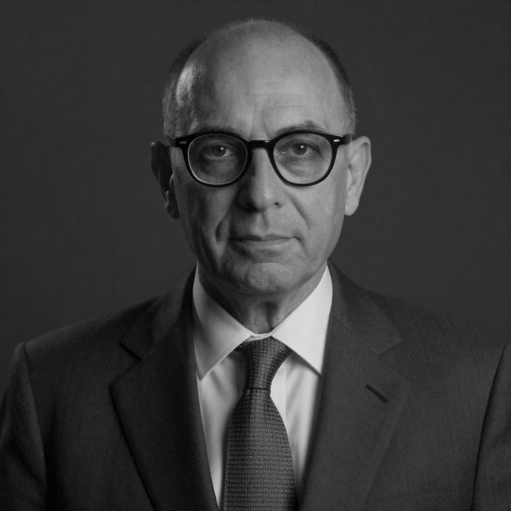 Black-and-white photograph of a middle-aged man with balding head, wearing thick glasses, dark suit, white shirt, and patterned tie. He has a serious expression. Dark background. Single person. Upper body portrait.