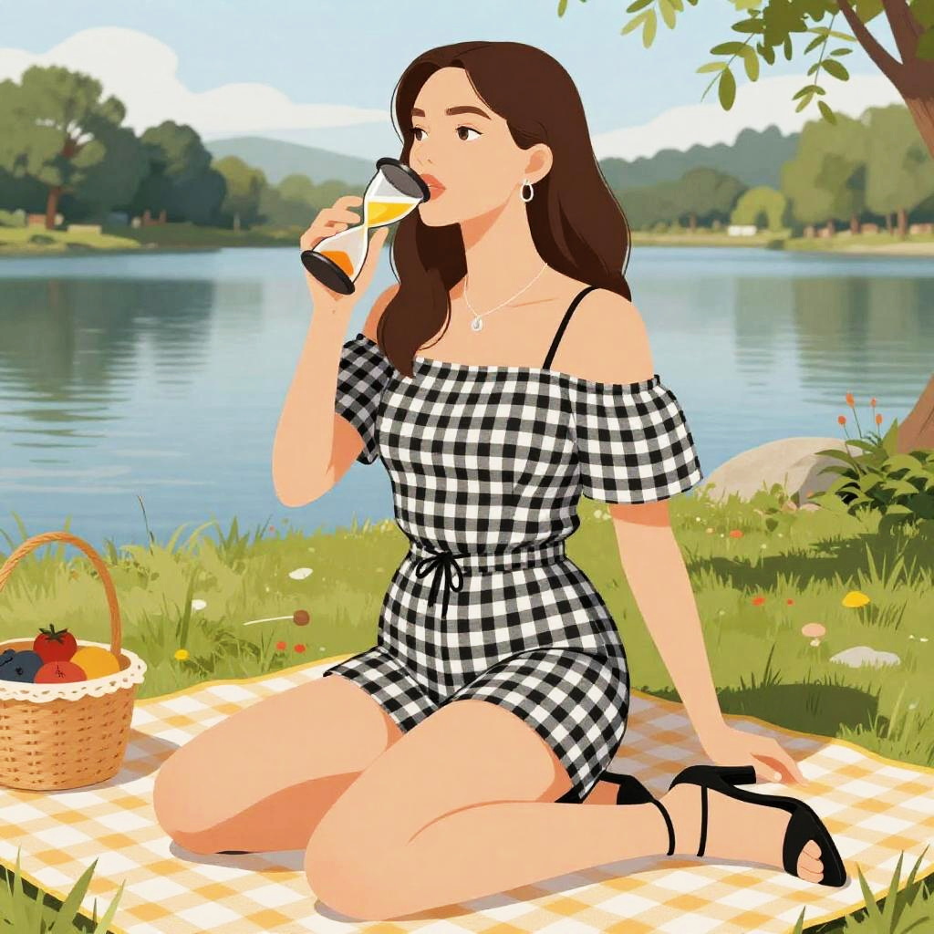 A Hourglass woman in a contemporary casual black and white gingham romper with cold-shoulder design, thigh-length shorts, and black strappy heels, minimalist silver jewelry, enjoying a picnic at the reservoir, illustrated in the style of IDW Publishing. Sexy. Pretty face and beutiful eyes