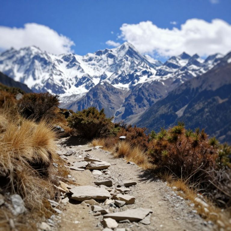 This is a photograph of a mountainous landscape. In the foreground, there's a rocky, dirt path with dry grass on either side. The midground features a mix of brown and green shrubs. The background showcases towering, snow-capped mountains under a bright blue sky with some white clouds. The image has a slightly blurred, digital art style.
