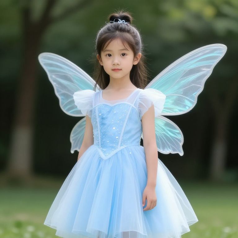 Photograph of a young Asian girl with fair skin and black hair in a bun, wearing a white, sleeveless, tulle dress with a fitted bodice. She has translucent, iridescent butterfly wings attached to her back and a small silver tiara on her head. She stands in a grassy park with a blurred, dark green forest background. Her expression is neutral, and she gazes directly at the camera. The lighting is natural, highlighting the delicate textures of her dress and wings.